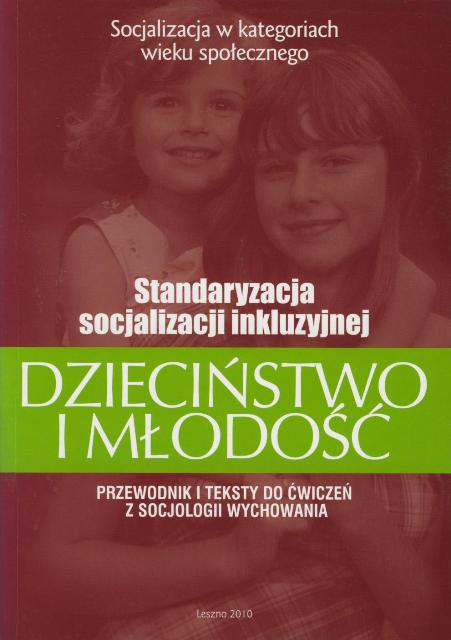 Dzieciństwo i młodość - standaryzacja socjalizacji inkluzyjnej / Jerzy Modrzewski, Dorota Sipińska, Agata Matysiak-Błaszczyk. Rozdz. 1. INTRODUKCJA: O kondycji socjologii wychowania / Jerzy Modrzewski, Dorota Sipińska, Agata Matysiak-Błaszczyk ; Teoretyczne i praktyczne aspekty procesu socjalizacji / Jerzy Modrzewski, Dorota Sipińska ; Wiek społeczny jako kryterium periodyzacji procesu socjalizacji. Wykaz podstawowych lektur z socjologii wychowania / Ewa Włodarczyk. Rozdz. 2. DZIECIŃSTWO: Wybrane problemy i propozycje ich realizacji / Jerzy Modrzewski, Dorota Sipińska, Agata Matysiak-Błaszczyk ; Sytuacja społeczna dziecka jako płaszczyzna jego uspołecznienia / Wiesław Ambrozik ; Socjalizacja religijna dziecka a kontekst społeczno-kulturowy / Władysław Piwowarski ; Proces socjalizacji dzieci - dzieciństwo jako kategoria społeczna / Adam Roter ; Dzieciństwo jako etap życia / Katarzyna Segiet. Rozdz. 3. MŁODOŚĆ: Problematyzacja i uwagi dotyczące realizacji treści programowych / Jerzy Modrzewski, Dorota Sipińska, Agata Matysiak-Błaszczyk ; Młodzież jako kategoria struktury socjodemograficznej / Daniel Markowski ; Młodzież a przemiany kultury współczesnej / Zbyszko Melosik ; Społeczne uczestnictwo młodzieży / Edyta Mianowska ; Podstawy wiedzy o organizacjach młodzieżowych i ruchu młodzieżowym / Heliodor Muszyński ; Młodzież współczesna / Krzysztof Przecławski ; Studia nad chłopskim systemem aksjonormatywnym / Józef Styk.